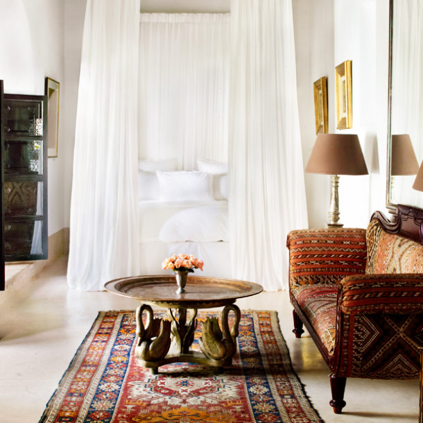 L’Hôtel Marrakech è un riad di proprietà privata, situato nel cuore della medina della “città rossa”. La posizione dell’Hôtel è comodamente vicina alla piazza animata di Jemaa El Fna, al vivace Souk e alla moschea Koutoubia del 12° secolo. Lo storico riad del 19° secolo che originariamente costituiva la parte centrale di un palazzo Caidal, comprende sei spaziose suite, circondate da un cortile con un giardino eccezionalmente grande ed una piscina. Questo affascinante rifugio unisce cibi deliziosi, massimo comfort e servizi in un ambiente che sfoggia l’eleganza tipica degli hotel degli anni Trenta. Di proprietà di Jasper Conran, il riad unisce il superbo artigianato marocchino a mobili, tessuti, sistemi di illuminazione e opere d’arte di antiquariato che fanno parte della sua collezione, rendendolo più simile a una casa che ad un hotel.