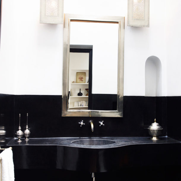 La suite Asilah è costituita da una serie di stanze al primo piano. L’area soggiorno comprende un caminetto aperto adiacente ad una stanza da bagno in tadelakt e gesso dipinto. La suite deve la sua luminosità alle ampie finestre e al grande lucernario. La camera da letto, con letto a baldacchino king-size, armadio e scrivania, si affaccia sul cortile con giardino e sulla piscina.