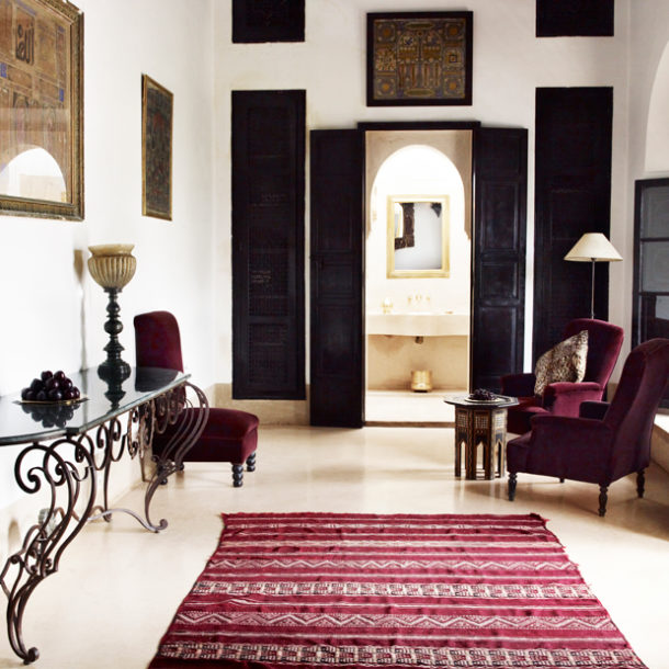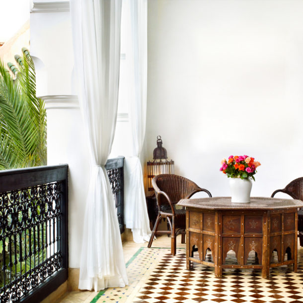 La suite Fez si trova al primo piano. Ha un aspetto luminoso e fresco con un soffitto alto e una terrazza privata che si affaccia sul giardino e sulla piscina. Per decorare la suite sono stati utilizzati dipinti raffinati, mobili e sistemi di illuminazione d’antiquariato. È dotata di letto a baldacchino e di due armadi molto grandi adiacenti ad una sala da bagno in tadelakt . È possibile unire questa suite alla suite Tangier per formare una suite familiare di camere.