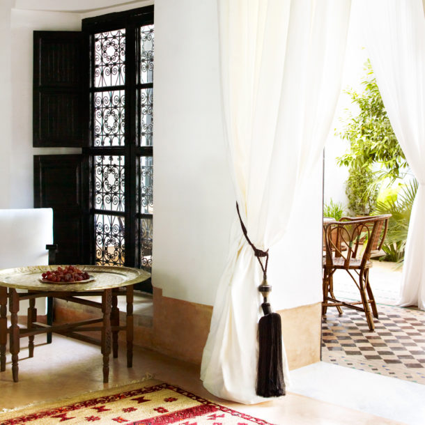 La suite Zagora, l’unica al piano terra, dispone di una terrazza privata che conduce al cortile con giardino e alla piscina. La suite è arredata in modo tradizionale marocchino, il letto a baldacchino king-size è tappezzato di voile bianco che conferisce un senso di freschezza e di ariosa serenità. Un corridoio con guardaroba sfocia in una sala da bagno in tadelakt.